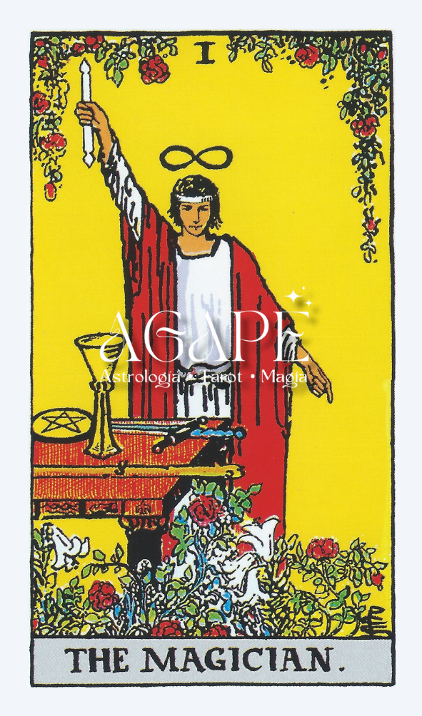 Iconografía y Arquetipos: En el Tarot Rider Waite el arcano mayor El Mago representa a un hombre vestido con una túnica blanca y roja como símbolos de la pureza y pasión de su personalidad, las herramientas mágicas en su mesa: una vara, un cáliz, una espada y un pentáculo representan los cuatro elementos (fuego, agua, aire y tierra) de los cuales dispone, tanto sus habilidades como creatividad y destreza se representan con el símbolo del infinito sobre su cabeza siendo una metáfora de su visión clara y definida para crear y aprovechar las oportunidades que tiene así como las que se le presenten. Una vara blanca con dos flamas del mismo color en su mano derecha apuntando al cielo hacen referencia de su poder personal así como de la acción dirigida y concentrada que posee para la materialización de sus objetivos. Su mano izquierda apuntando al suelo hace referencia a su profunda conexión con el plano terrenal. Está rodeado de un frondoso jardín de rosas rojas y lirios blancos reafirmando la pureza de sus pasiones así como de su encantadora personalidad, la cual a partir de la maduración de su intelecto, armoniza y construye aquello que se proponga. El fondo amarillo del arcano hace referencia al poder de la luz que le inyecta de vitalidad y nitidez sobre aquello que visualiza. El Mago es el arquetipo del poder personal, la habilidad para manifestar aquello que desea así como la materialización de la voluntad del espíritu.