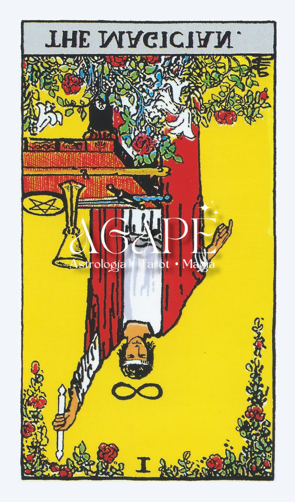 Puede representar también una pérdida de autenticidad, donde el consultante proyecta una imagen falsa o actúa de manera manipuladora para obtener beneficios personales. La astucia natural del Mago se vuelve en su contra, convirtiéndose en artimaña o distracción. La carta invita a una revisión ética de la manera en que se ejercen las propias facultades y del uso que se da al conocimiento o la persuasión.
