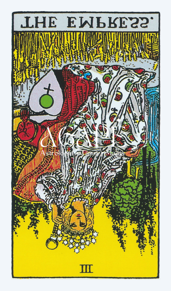 Amor: En el terreno amoroso, La Emperatriz invertida advierte sobre inseguridades, baja autoestima o dependencia afectiva que pueden interferir en la armonía de la relación. Puede indicar actitudes de complacencia excesiva que llevan a descuidar las propias necesidades, o bien el extremo contrario: comportamientos poco sanos, como la indiferencia, la crueldad emocional o el uso del afecto como forma de manipulación.
